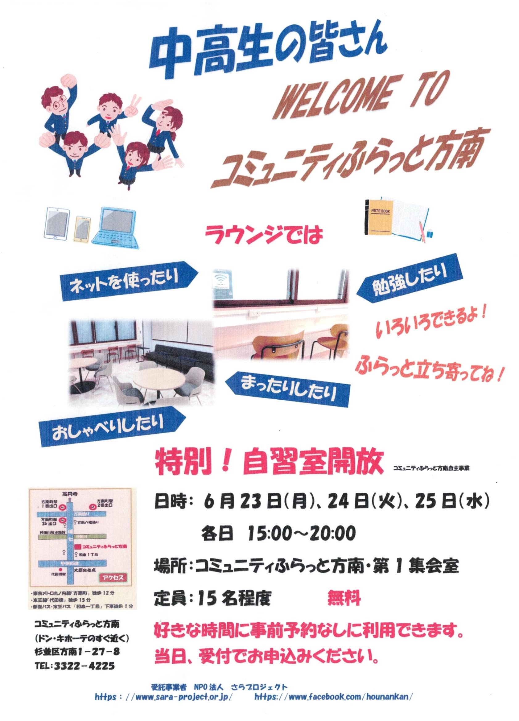 この度、コミュニティふらっと方南では、 中高生のみなさんを対象に、特別! 自習室を開放します。