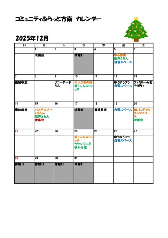 コミュニティふらっと方南では、12月もさまざまなプログラムを開催いたします。