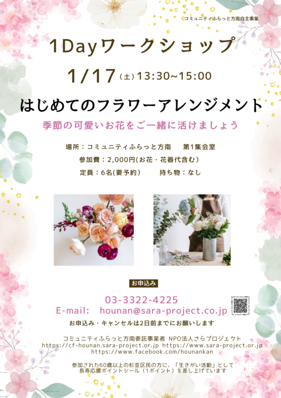新企画、 1Day ワークショップ はじめてのフラワーアレンジメントのお知らせです。